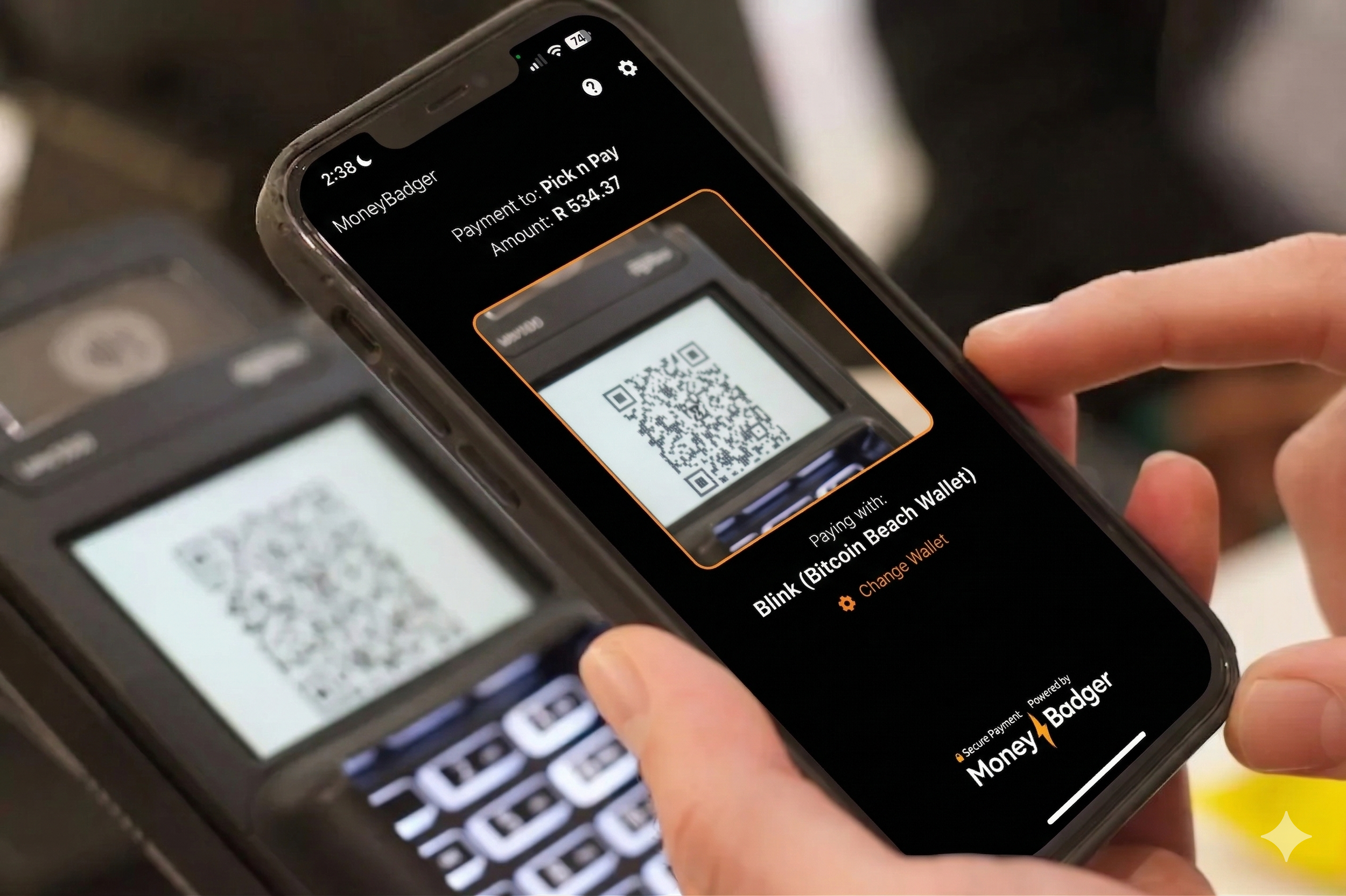 For wallets that don't, the free MoneyBadger app decodes the in-store QR code and hands the payment to your wallet. It opens straight to the camera — tap and scan.