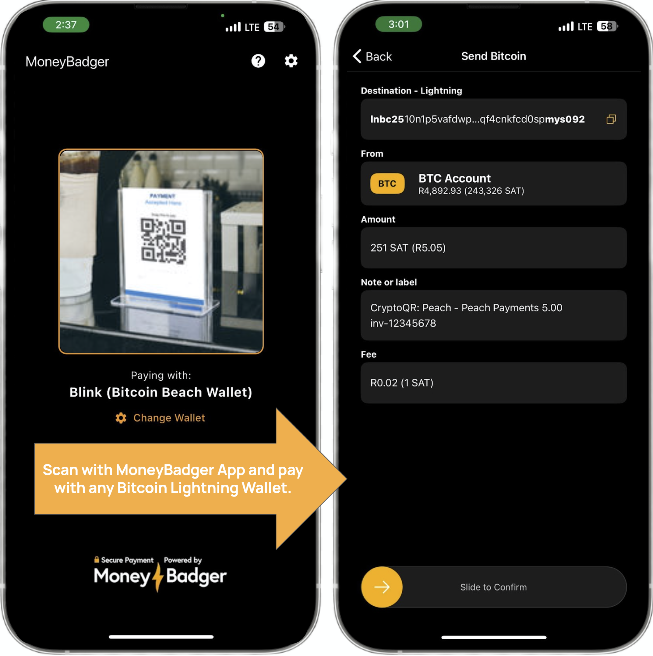 Use MoneyBadger to scan any QR code in South Africa to pay with Bitcoin!